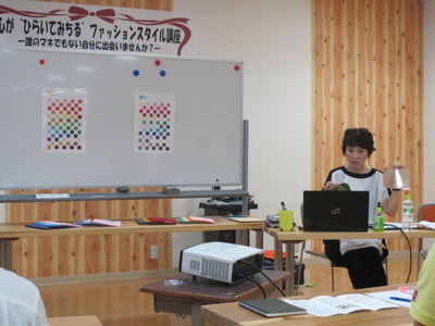 「好き」の感覚軸とストーリー、「無難」と「好き」、似合う色は外面の色、好きな色は内面の色、などを実体験を交えてお話していただきました。中でも参加者の目が光った内容が「パーソナルカラー」。今回は大まかに2つに分けるタイプの診断をしていただきました♪隣の人とペアになり、金の台紙と銀の台紙を順番に鼻の下に当てて、お互いに診断し合ってました(o^^o)参加者の方からは「自分に似合うカラートーンがわかってよかった」「今まで着なかった服にもチャレンジしてみようと思います」などの声をいただきました。