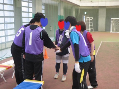ドリブルの練習、パスの練習、シュートの練習を行った後、男女混合チームに分かれてミニゲームを行いました。チームごとに円陣を組んだり、得点を入れたらハイタッチをしたりと、すごく盛り上がりました♪