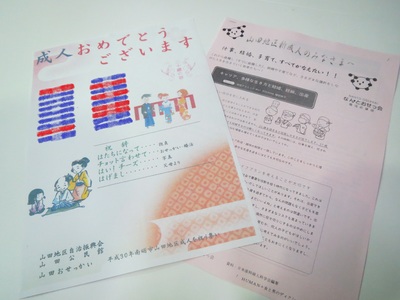 婚活応援団なんとおせっ会メンバーでもある西井秀子さんが「今は多様な生き方を尊重する時代だからこそ、仕事・結婚・子育て、すべて叶えてください。まだまだ成人だと思っていても、そのときはすぐに来るよ!」と愛情を込めたメッセージを今年の山田地区新成人18名に贈っておられました。