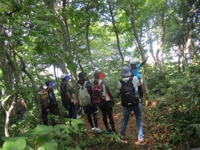 高落場山の見所といえばブナ原生林♪ 平地域と城端地域の境目がトレッキングコースになっており、平地域と城端地域に生えているブナの違いなどをナチュラリストの方に解説していただきました。