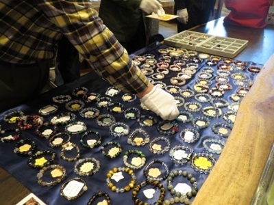 次にパワーストーン選び!今回の参加男性は、「パワーストーンを選ぶこと」というより「近くで見ること」も初めての方ばかり♪まずは「どれにしようかなー」と頭で考えて選ぶのではなく、直感で2種類の石を選んでもらいました。石をインスピレーションで選んだあと、意味を熟読。その石が発するパワーと自分自身の望みのマッチング具合を、みんなで確かめてみました。