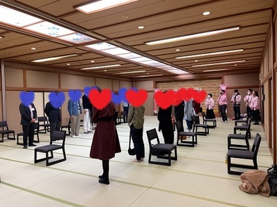 その後は一足先に男性がご対面会場に入り、女性の入場を待ちました。女性は会場に入場後、男性に背中を向けて一列に並び、ご対面の準備。合図と共に振り返ってご対面となりました! このときだけはお互いにマスクを外して顔を見合わせました。男性がひとりずつマイクを持って自己紹介をした後、続いて女性からも自己紹介。お互いに、これから2日間を過ごす相手を認識する、緊張の時間となりました。