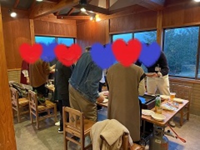 雨が降り始めた中、バスに乗って全員で宿泊場所である閑乗寺公園へ移動しました。コテージに荷物を置いた後はバーベキュー会食スタート。全天候対応のバーベキュー施設で、男女和気あいあいと美味しいお肉とお酒を楽しみました。