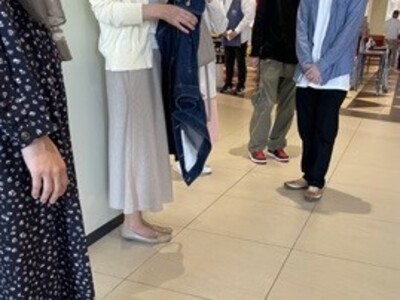 午前10時に現地集合。「今日の呼び名」をお互いに自己紹介したあと、さっそくショッピングを開始しました。広いアウトレット内を歩き回りながら、男女両方の服を扱っているお店に立ち寄りました。男性の服に女性がアドバイスしたり、女性同士で試着して感想を言い合ったり、楽しい時間を過ごしました。
